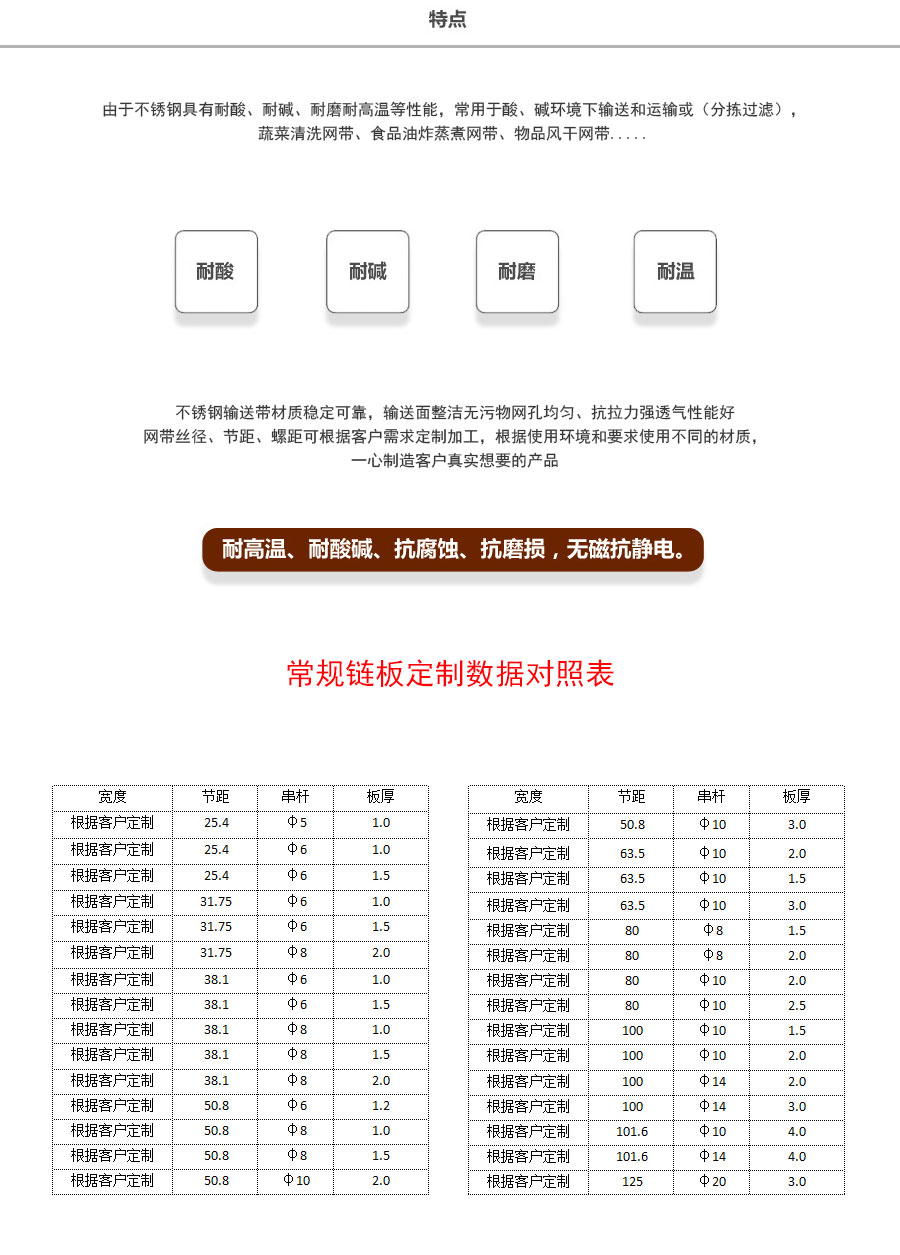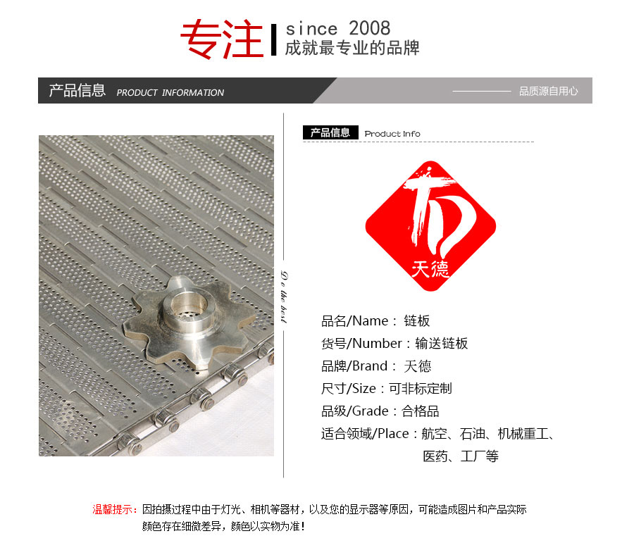 天德溫馨提示:輸送鏈板是定制產(chǎn)品,規(guī)格及報(bào)價(jià)會(huì)根據(jù)板厚、節(jié)距、串桿直徑、材質(zhì)、寬度、長(zhǎng)度來(lái)計(jì)算,親 也可以告訴我們使用要求、應(yīng)用環(huán)境、每米載重量,由我們來(lái)幫您推薦定制數(shù)據(jù),盡力做到定制的產(chǎn)品即夠用也不浪費(fèi)。