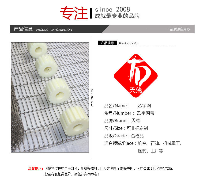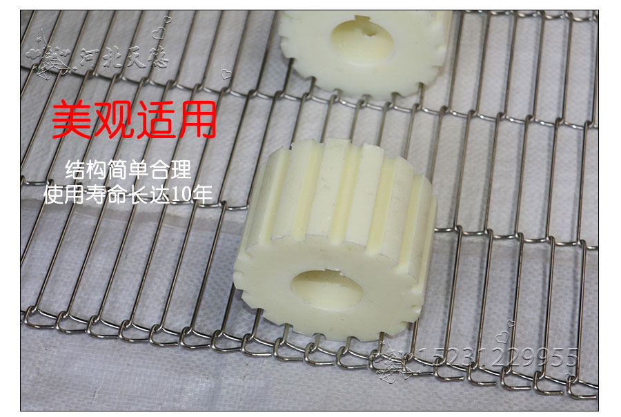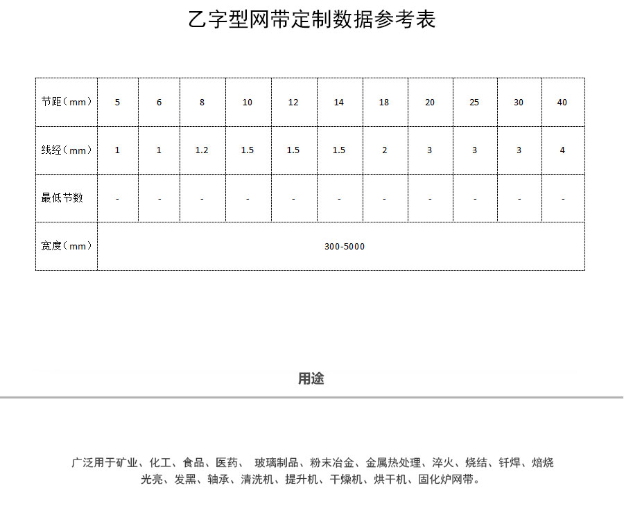 乙字網(wǎng)帶:又稱梯形網(wǎng)帶或一字網(wǎng),此網(wǎng)帶通常系齒輪傳遞網(wǎng)帶,具有透氣性好的優(yōu)點,拉力均勻,做工精細,此網(wǎng)帶具有轉(zhuǎn)動靈活、平穩(wěn)性好、耐高溫、耐壓力、耐腐蝕、壽命 長等特點。主要用于餅干機圖層,輕物品輸送及電子回流焊等