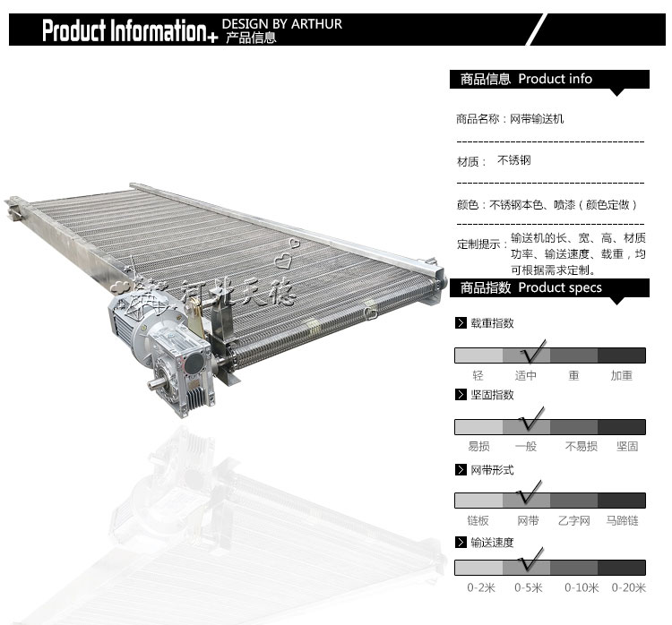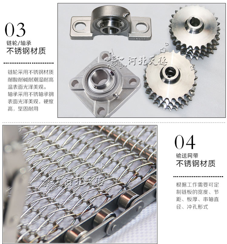 1.網(wǎng)帶輸送機(jī)以不銹鋼網(wǎng)帶為輸送介質(zhì),其特性堅(jiān)固,耐磨、不拍尖銳的物品劃傷,輸送豬肉、雞鴨、魚(yú)蝦等干凈衛(wèi)生;